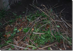Depois de amarradas, coloco-as ao alto no local onde termina a ramada que tem arames de esteio a esteio que lhes serve de apoio. Para o ano escolho as que ainda estão boas e rejeito as podres. O ideal seria guardar num local abrigado (pelo menos de teto para não apanharem chuva), mas o barracão que tenho para este efeito está ocupado e desarrumado com um amontoado de madeiras de mobílias velhas que foram juntando. E até eu ter oportunidade e espaço livre na horta para poder arrumar e queimar estas madeiras velhas, não poderei usufruir deste espaço para a ideal e verdadeira função do mesmo. Se guardasse as estacas no barracão, estas durariam muito mais tempo. Como tenho um pequeno espaço com plantação de canas, vou remediando a quantidade que apodrece porque recorro anualmente a novas canas que servirão para a estacaria do ano.