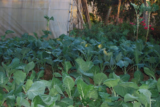 Tem 3 regos de couve galega, 2 regos de brócolos, 4 regos de penca, 3 regos de coração e na borda alguns pés de alface.