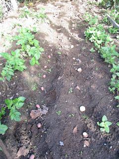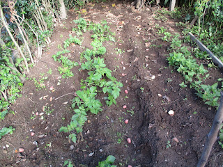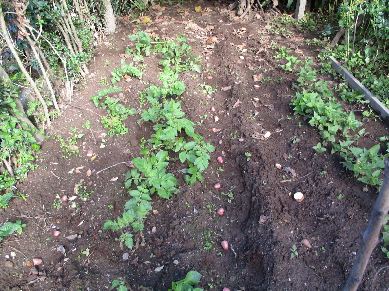 Do lado direito tem batatas já com rama grande, quando semeei estes 2 regos não tinha mais batatas greladas por isso não deu para semear este bocadinho todo. Como agora apareceu batatas greladas no cesto da cozinha vim planta-las aqui para acabar de preencher este bocadinho de terra com batatas. A minha intenção era ter batata nova para o Natal, mas já semeei muito tarde, são necessários cerca de 3 meses.