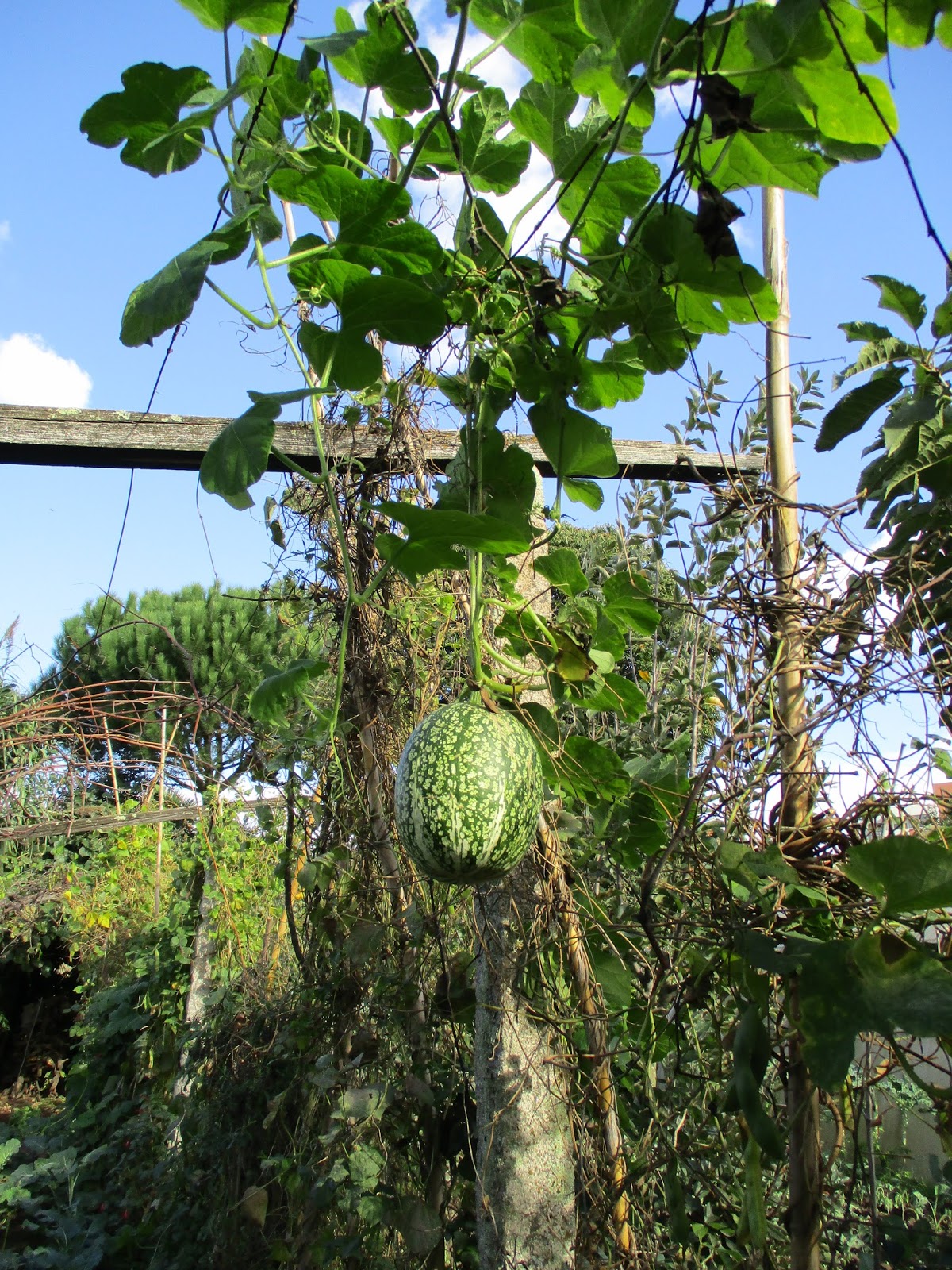 Nunca semeio chilas, elas lá aparecem e quase sempre em sítios diferentes. Trepam por tudo à sua volta: ramada, árvores, estacas, paus, couves...