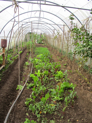 Vista do interior da estufa do lado de baixo, a 1ª foto tem sementeiras acabadas de semear (cebolo, alface, cenoura, repolho). A 2ª foto é parte da "confusão" que por aqui vai, digo confusão porque é uma mistura de plantas, eu faço referência à couve acelga e à beterraba porque tem em maior quantidade, mas também tem aipo, salsa, cenoura, couve galega, chicória, tomates, piri-piris, pepino.