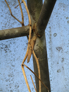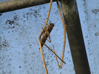 Hoje quando dava a minha voltinha matinal de máquina fotográfica na mão, encontrei este gafanhoto ao fundo da estufa. Deve ter pernoitado aqui à procura do quente.