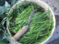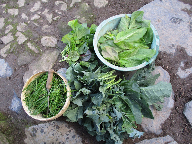 Colheita dos alimentos para alimentar as aves e a porquinha-da-india. Todos eles adoram azevem verdinho, tenro e acabado de cortar, a cheirar a erva fresca. E as hortaliças frescas acabadas de colher. Esta foi a refeição de ontem, como foi domingo, tiveram direito a mais variedade de verduras.
