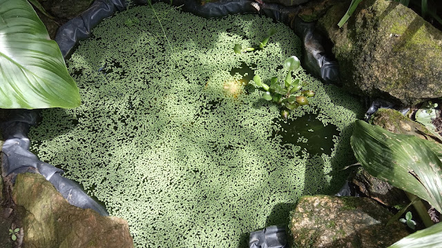 Alguns dos recipientes que fazem de lagos com plantinhas aquáticas.