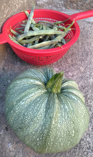 Mais três abóboras verdes retiradas de um pé de abóbora que nasceu no meio deste rego de feijões (foto em baixo), pode-se ver o rego de feijões à esquerda a todo o comprimento da imagem.