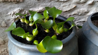 Trouxe estes jacintos de água do rio e coloquei nesta pia de pedra. Ficaram lindos, agora é só esperar que venham as flores.