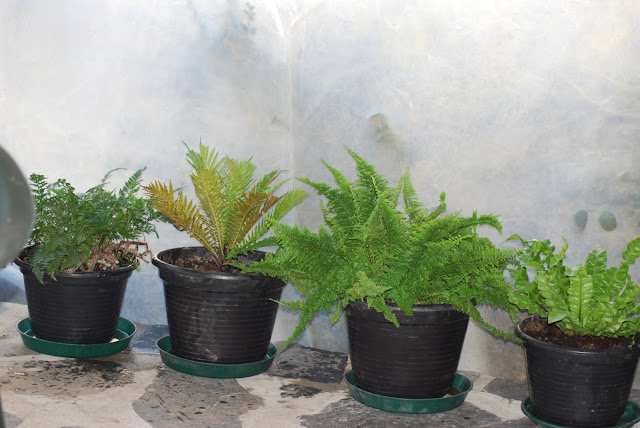 Vasos com plantinhas ornamentais de folhas verdes que tenho no alpendre da churrasqueira. Neste local estão e protegidas do frio e do vento.
